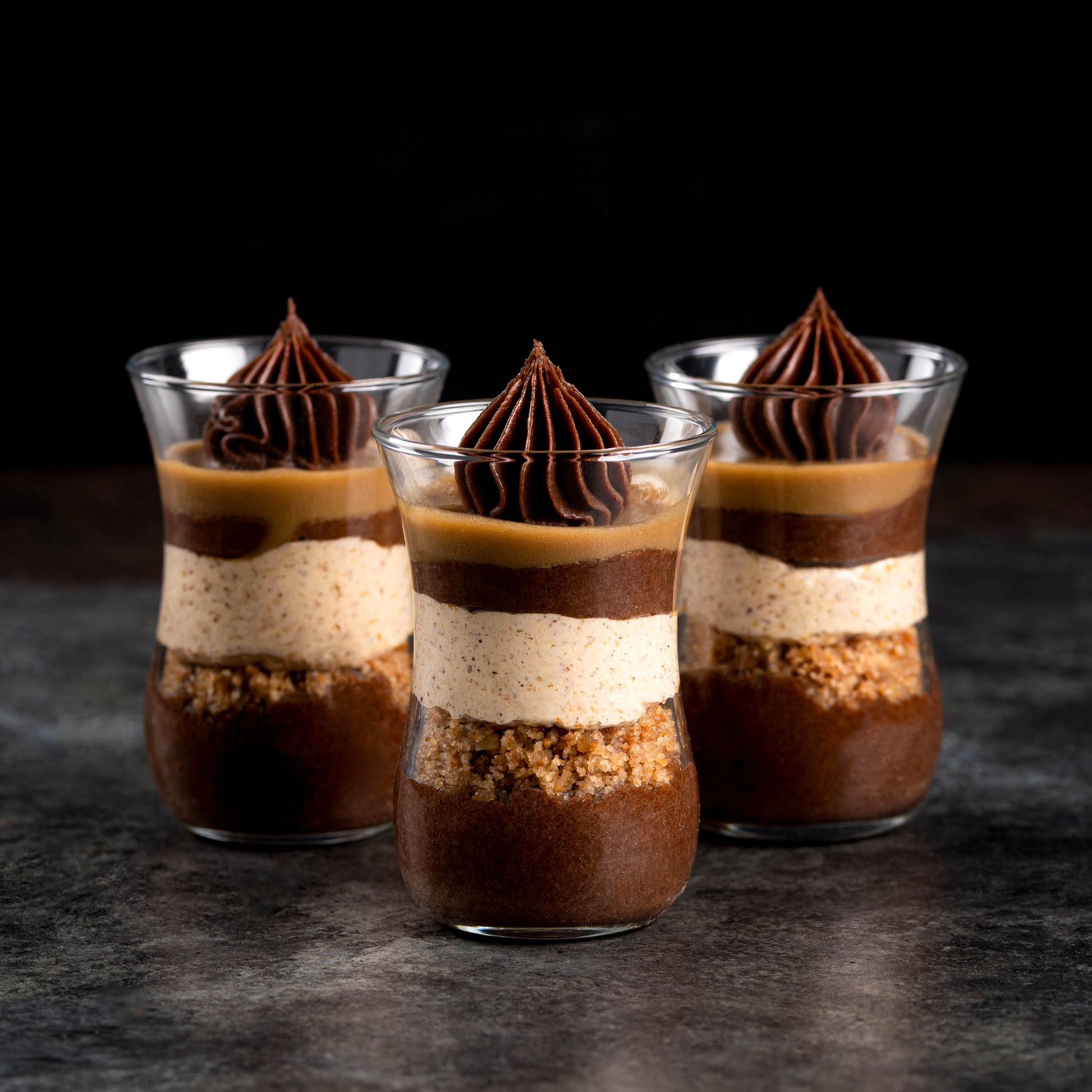 This is one of our most popular desserts. We layer rich chocolate crème, walnut cake layer, our famous brittle crunch crème, topped with caramel crème & crowned with a finishing touch of dark chocolate crème.