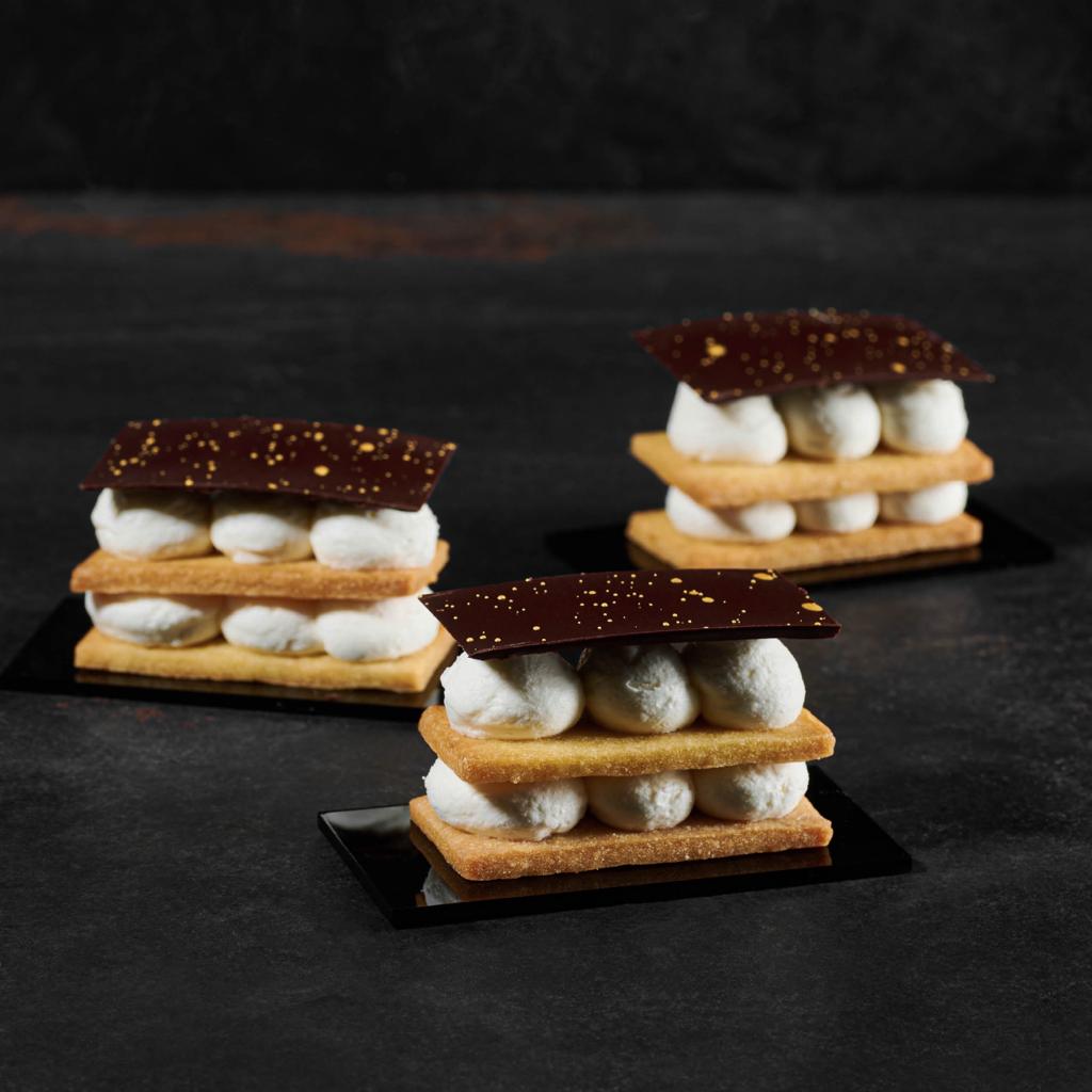 This layered work of art features rectangular crisp, golden cookies balanced on tiers of silky non-dairy cream cheese style piped creme. It's a delightful contrast of flavor and texture. The dessert is finished with a crisp choclate bark slab, speckled with gold flecks for a dash of glamor. The architecture of this dessert is both modern and striking.