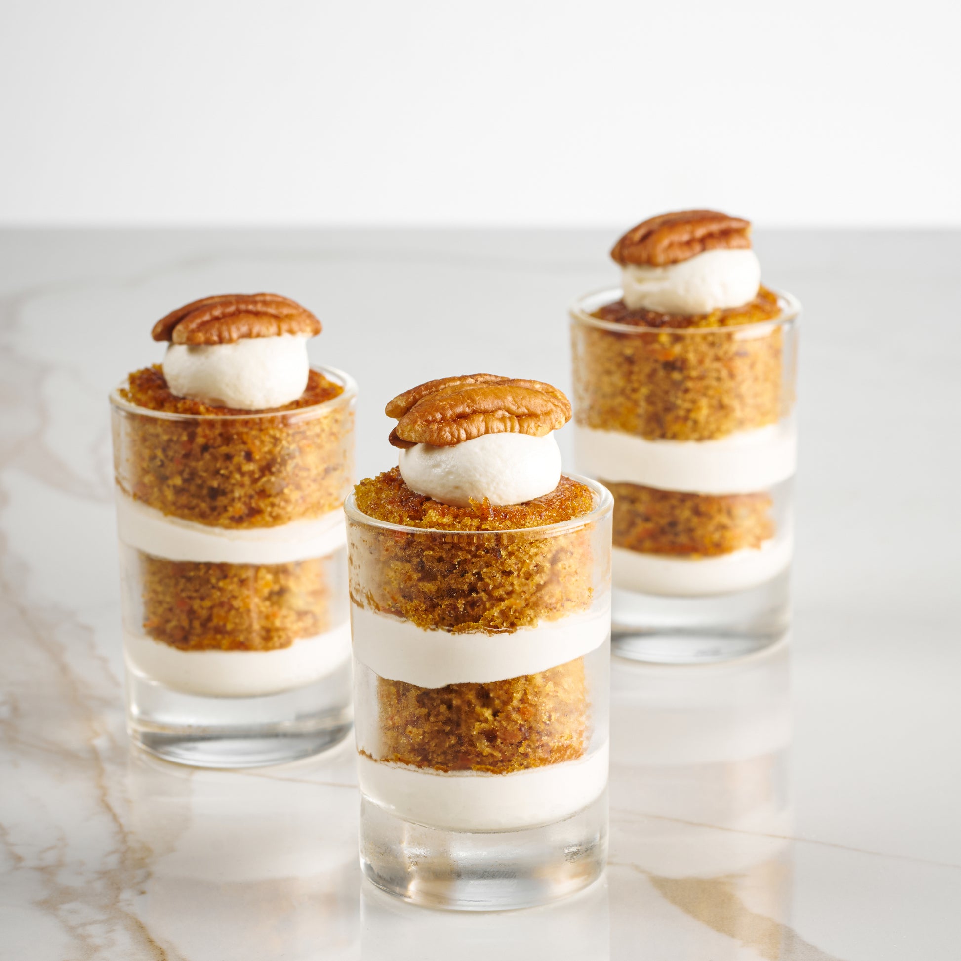 Discover a fresh twist on classic frosted DAIRY carrot cake in an elegant miniature. Layers of moist carrot cake alternate with a creamy, dairy cream cheese fill, crowned with a pecan. Perfectly presented for a modern indulgence in every spoonful.