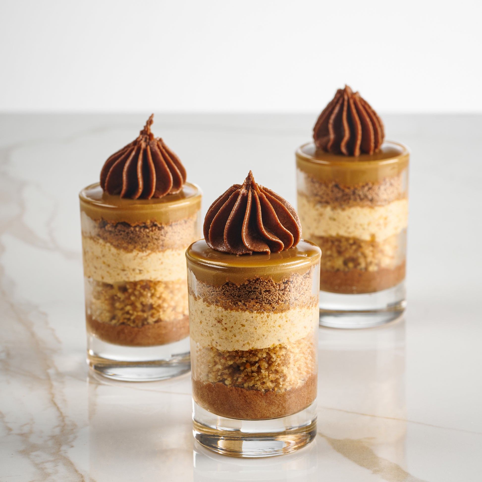 The Dairy Carmel shotglass is our best seller. This is modern twist on one of our most popular desserts. We layer rich chocolate crème, walnut cake layer, our famous brittle crunch crème, and a layer of milk chocolate, topped with caramel crème & crowned with a finishing touch of dark chocolate crème