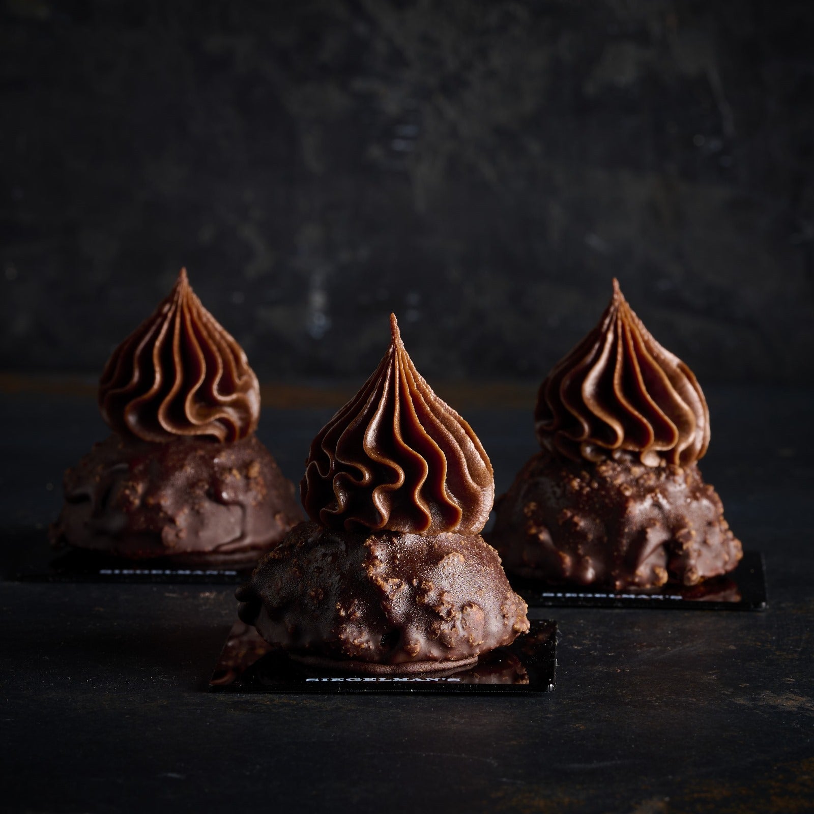 These distinctive chocolate pecan domes feature an incredible, rich chocolate pecan praline filling, made with toasted pecans and dark chocolate. Coated with a dark chocolate crunch couverture, and accented with a piped swirl of silky chocolate creme.