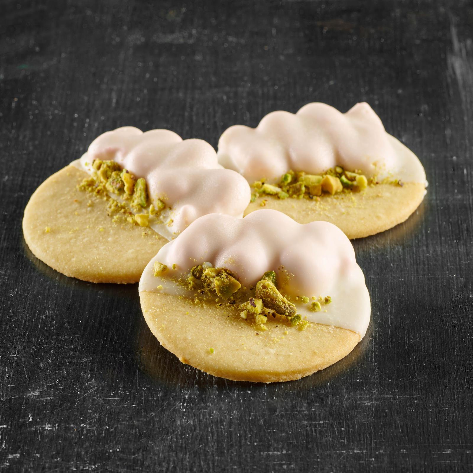 We begin with a round, elegant cookie that is slender and crisp. It's then topped with a drizzle of strawberry cream made with real strawberries. A pop of strawberry notes comes through with a bright strawberry curd layer. Each cookie is hand-dipped in white chocolate. A smattering of finely-chopped pistachio adds an accent color and flavor. A modern and whimsical look that is entirely unique.