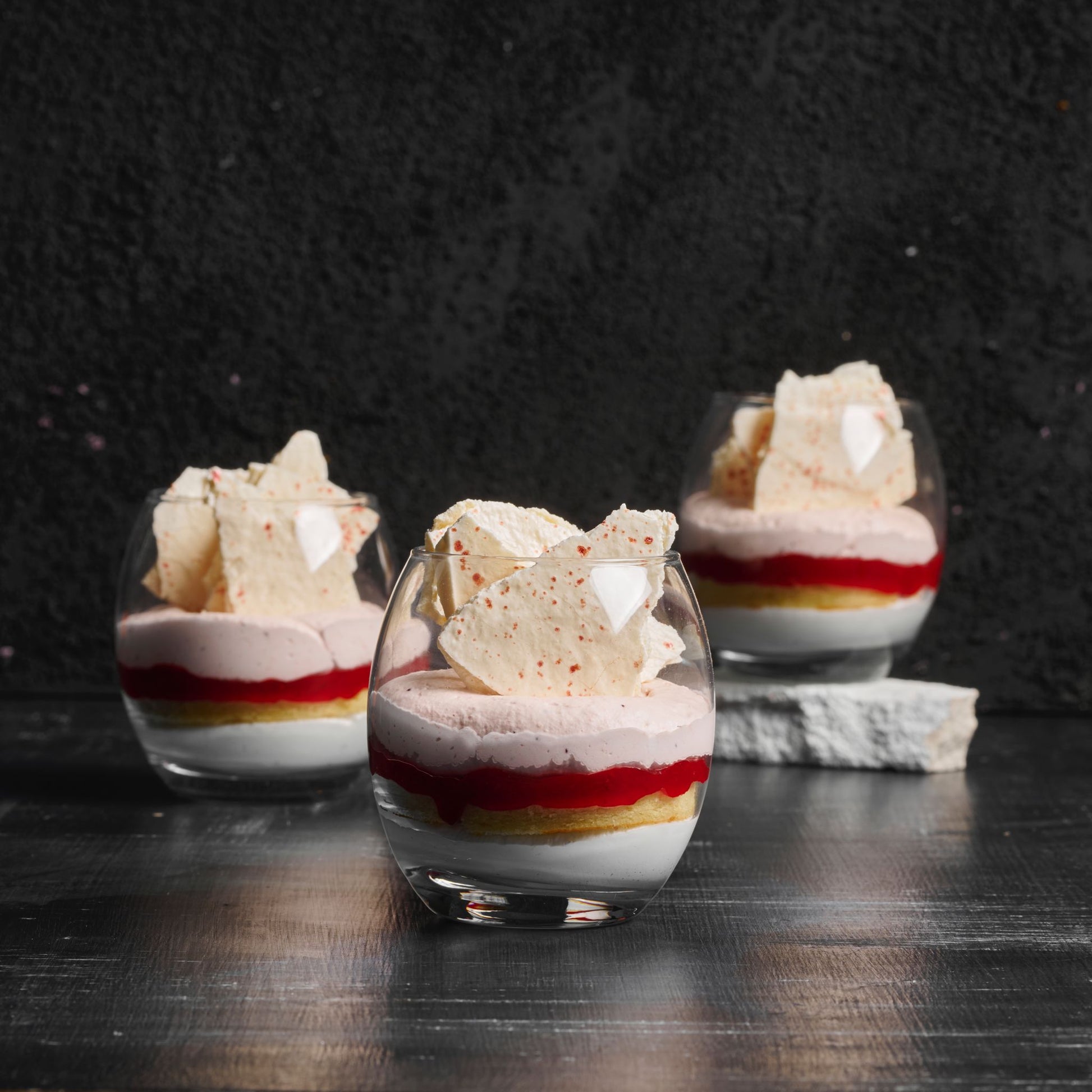 A delicate layered dessert of créme, heavenly shortcake, strawberry curd, and strawberry créme layer made with real strawberries! Topped with speckled meringue shards. This makes a perfectly light dessert ending to that special meal.