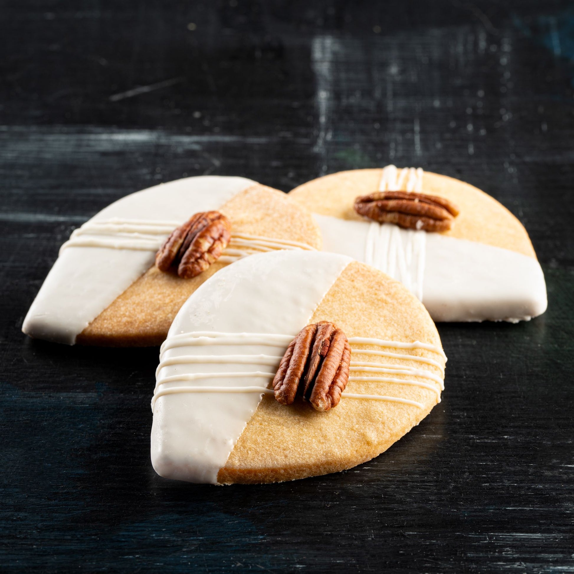 Siegelman's sugar cookies are famously popular for their attention to detail and balanced flavor and texture. These teardrop cookies are eye-catching and dramatic. Half-dipped in white chocolate for a richly decadent touch and accented with a toasted Pecan